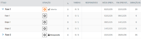 Regra Essencial: Para alterar o prazo da Fase, você deve ajustar as datas previstas das Etapas e Tarefas que a compõem.